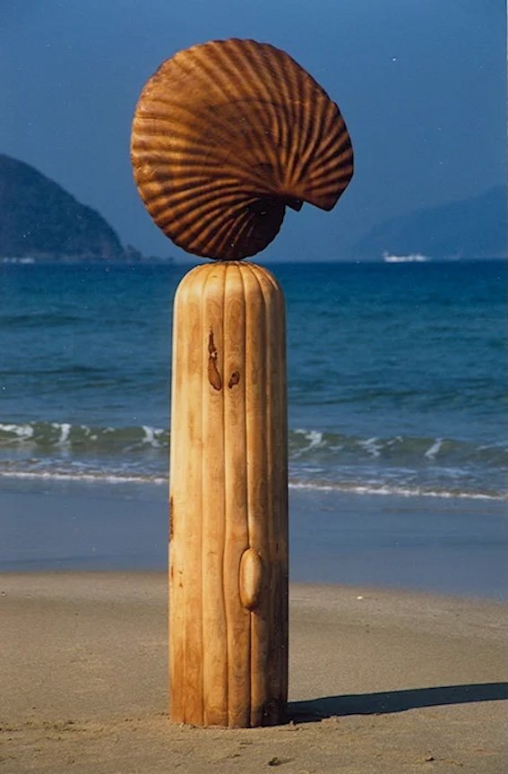 Sea Child  camphor wood, 6' high. Based on an argonaut shell brought to my feet by wind and waves during a typhoon on a beach in western Japan.